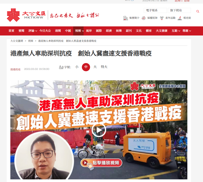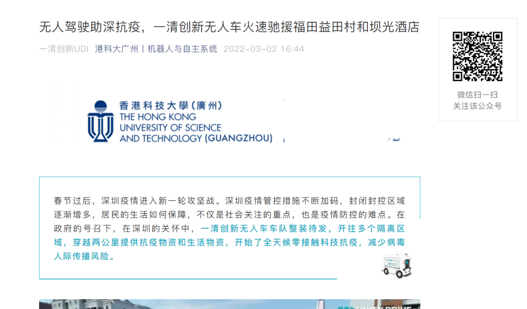 随着疫情的发酵,深圳疫情管控措施也更加严格,拥有香港科技大学背景的一清创新无人车车队在3月初火速驰援多个隔离区域,负责社区入口与封控区之间的物资运输、社区内的防疫物资配送、协助上门督促核酸检测等工作,在深圳城中村12天累计运送抗疫物资数十趟,总件数近四百件,全天候运行,减少病毒人际传播风险。