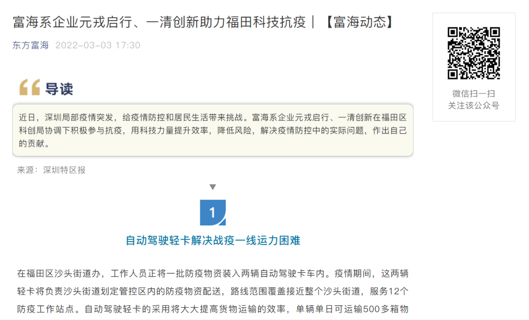基于疫情期间一清无人车的有效运输防疫物资和一清同事们通宵达旦的积极投入抗疫工作,深圳益田村疫情防控现场管控工作指挥部还专门颁发感谢信。